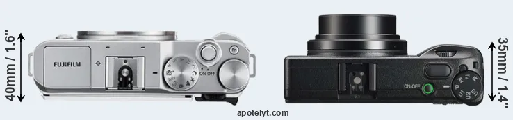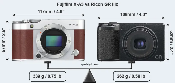 The physical size and weight of the Fujifilm X-A3 and the Ricoh GR IIIx are illustrated in the side-by-side display below. The two cameras are presented according to their relative size. Three consecutive perspectives from the front, the top, and the back are available. All size dimensions are rounded to the nearest millimeter.