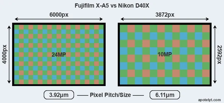Despite having a slightly smaller sensor, the Fujifilm X-A5 offers a higher resolution of 24 megapixels, compared with 10 MP of the Nikon D40X. This megapixels advantage comes at the cost of a higher pixel density and a smaller size of the individual pixel (with a pixel pitch of 3.92μm versus 6.11μm for the D40X). However, it should be noted that the X-A5 is much more recent (by 10 years and 10 months) than the D40X, and its sensor will have benefitted from technological advances during this time that make it possible to gather light more efficiently.