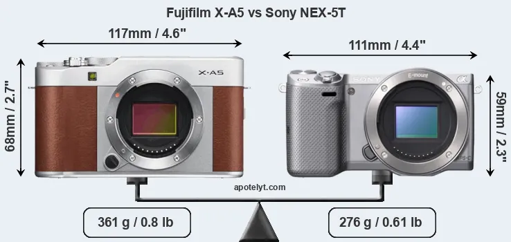 If the front view area (width x height) of the cameras is taken as an aggregate measure of their size, the Sony NEX-5T is notably smaller (18 percent) than the Fujifilm X-A5. Moreover, the NEX-5T is markedly lighter (24 percent) than the X-A5. In this context, it is worth noting that neither the X-A5 nor the NEX-5T are weather-sealed.