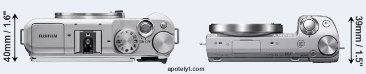 The physical size and weight of the Fujifilm X-A5 and the Sony NEX-5T are illustrated in the side-by-side display below. The two cameras are presented according to their relative size. Three consecutive views from the front, the top, and the rear side are shown. All size dimensions are rounded to the nearest millimeter.