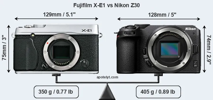 An illustration of the physical size and weight of the Fujifilm X-E1 and the Nikon Z30 is provided in the side-by-side display below. The two cameras are presented according to their relative size. Three successive views from the front, the top, and the rear are shown. All width, height and depth dimensions are rounded to the nearest millimeter.