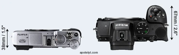 The physical size and weight of the Fujifilm X-E1 and the Nikon Z5 are illustrated in the side-by-side display below. The two cameras are presented according to their relative size. Three consecutive perspectives from the front, the top, and the back are available. All width, height and depth dimensions are rounded to the nearest millimeter.