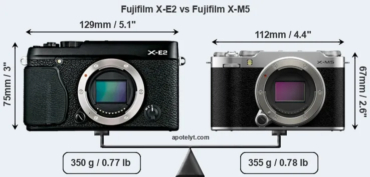 An illustration of the physical size and weight of the Fujifilm X-E2 and the Fujifilm X-M5 is provided in the side-by-side display below. The two cameras are presented according to their relative size. Three consecutive perspectives from the front, the top, and the back are available. All width, height and depth measures are rounded to the nearest millimeter.