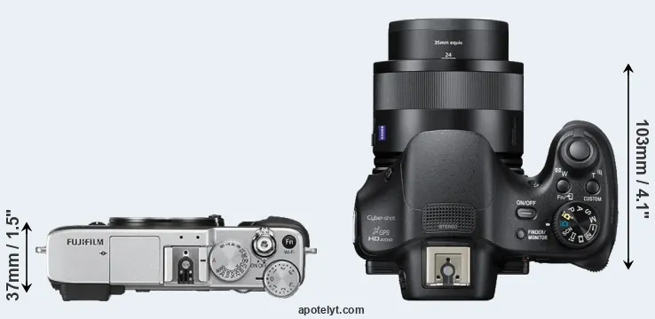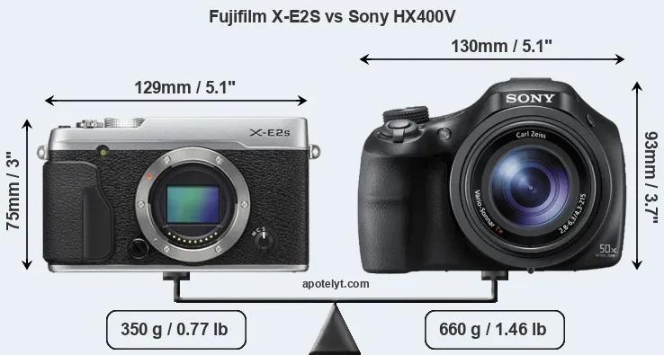 The physical size and weight of the Fujifilm X-E2S and the Sony HX400V are illustrated in the side-by-side display below. The two cameras are presented according to their relative size. Three consecutive views from the front, the top, and the rear side are shown. All width, height and depth measures are rounded to the nearest millimeter.