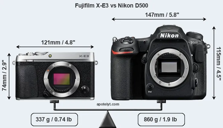 The physical size and weight of the Fujifilm X-E3 and the Nikon D500 are illustrated in the side-by-side display below. The two cameras are presented according to their relative size. Three consecutive perspectives from the front, the top, and the back are available. All size dimensions are rounded to the nearest millimeter.
