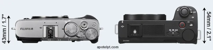 The physical size and weight of the Fujifilm X-E3 and the Sony ZV-E10 II are illustrated in the side-by-side display below. The two cameras are presented according to their relative size. Three consecutive views from the front, the top, and the rear side are shown. All size dimensions are rounded to the nearest millimeter.