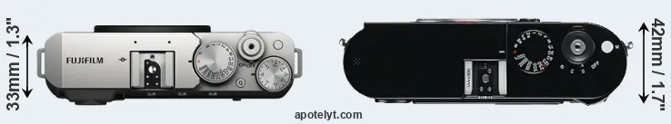 The physical size and weight of the Fujifilm X-E4 and the Leica M Typ 240 are illustrated in the side-by-side display below. The two cameras are presented according to their relative size. Three consecutive views from the front, the top, and the rear side are shown. All width, height and depth dimensions are rounded to the nearest millimeter.