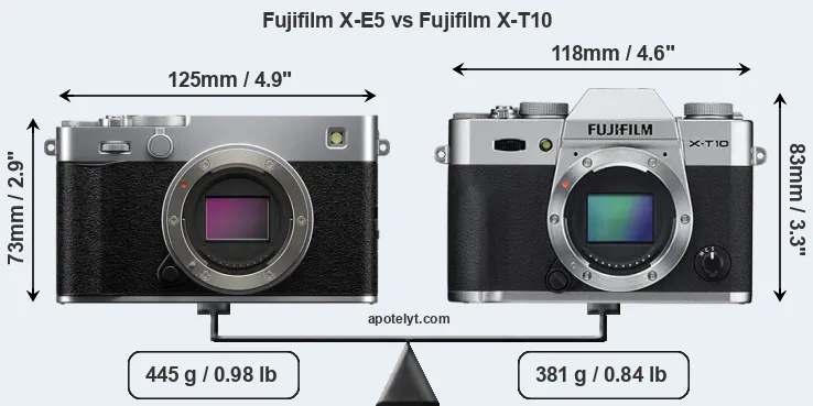 The physical size and weight of the Fujifilm X-E5 and the Fujifilm X-T10 are illustrated in the side-by-side display below. The two cameras are presented according to their relative size. Three consecutive perspectives from the front, the top, and the back are available. All width, height and depth dimensions are rounded to the nearest millimeter.