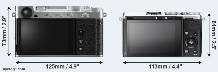 The side-by-side display below illustrates the physical size and weight of the Fujifilm X-E5 and the Fujifilm X70. The two cameras are presented according to their relative size. Three consecutive perspectives from the front, the top, and the back are available. All width, height and depth dimensions are rounded to the nearest millimeter.