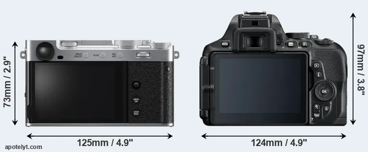 The side-by-side display below illustrates the physical size and weight of the Fujifilm X-E5 and the Nikon D5600. The two cameras are presented according to their relative size. Three consecutive views from the front, the top, and the rear side are shown. All width, height and depth dimensions are rounded to the nearest millimeter.