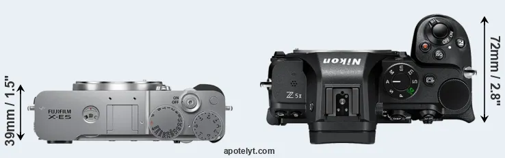 An illustration of the physical size and weight of the Fujifilm X-E5 and the Nikon Z5 II is provided in the side-by-side display below. The two cameras are presented according to their relative size. Three consecutive views from the front, the top, and the rear side are shown. All width, height and depth measures are rounded to the nearest millimeter.