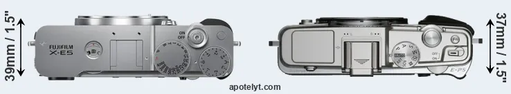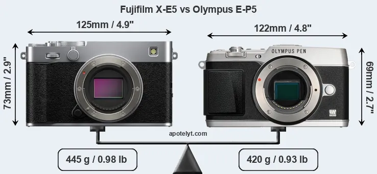 The side-by-side display below illustrates the physical size and weight of the Fujifilm X-E5 and the Olympus E-P5. The two cameras are presented according to their relative size. Three consecutive perspectives from the front, the top, and the back are available. All width, height and depth dimensions are rounded to the nearest millimeter.