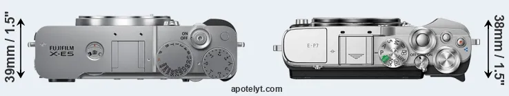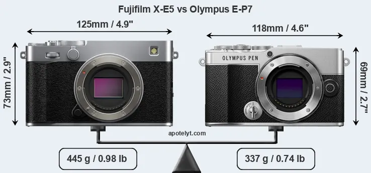 The physical size and weight of the Fujifilm X-E5 and the Olympus E-P7 are illustrated in the side-by-side display below. The two cameras are presented according to their relative size. Three consecutive perspectives from the front, the top, and the back are available. All width, height and depth dimensions are rounded to the nearest millimeter.