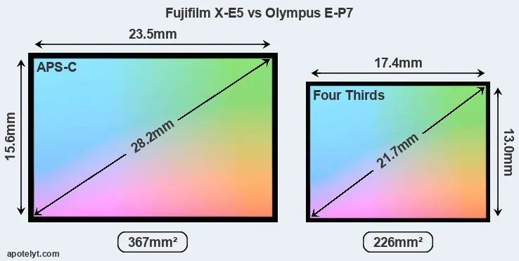Of the two cameras under consideration, the Fujifilm X-E5 features an APS-C sensor and the Olympus E-P7 a Four Thirds sensor. The sensor area in the E-P7 is 38 percent smaller. As a result of these sensor size differences, the cameras have a format factor of, respectively, 1.5 and 2.0. The sensor in the X-E5 has a native 3:2 aspect ratio, while the one in the E-P7 offers a 4:3 aspect.