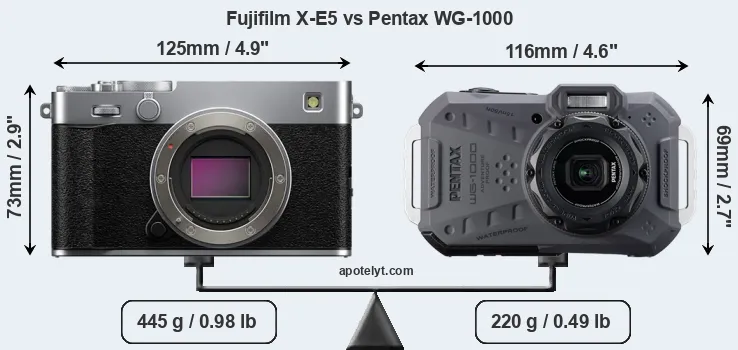 The side-by-side display below illustrates the physical size and weight of the Fujifilm X-E5 and the Pentax WG-1000. The two cameras are presented according to their relative size. Three consecutive perspectives from the front, the top, and the back are available. All width, height and depth dimensions are rounded to the nearest millimeter.