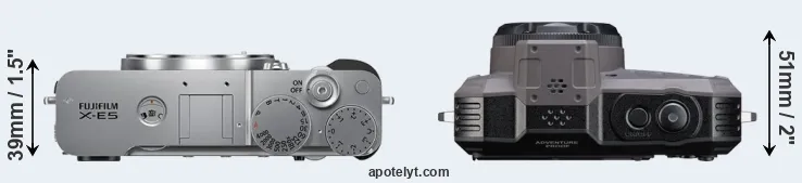 If the front view area (width x height) of the cameras is taken as an aggregate measure of their size, the Pentax WG-1000 is notably smaller (12 percent) than the Fujifilm X-E5. It is noteworthy in this context that the WG-1000 is splash and dust-proof, while the X-E5 does not feature any corresponding weather-sealing. More than that, the WG-1000 is water-proof up to 15m and can, thus, be used for underwater photography.