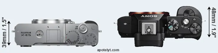 The side-by-side display below illustrates the physical size and weight of the Fujifilm X-E5 and the Sony A7S. The two cameras are presented according to their relative size. Three successive views from the front, the top, and the rear are shown. All width, height and depth dimensions are rounded to the nearest millimeter.