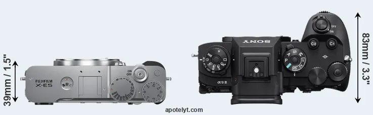 The side-by-side display below illustrates the physical size and weight of the Fujifilm X-E5 and the Sony A9 III. The two cameras are presented according to their relative size. Three consecutive views from the front, the top, and the rear side are shown. All width, height and depth dimensions are rounded to the nearest millimeter.