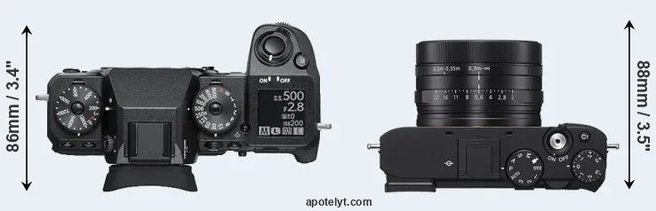 An illustration of the physical size and weight of the Fujifilm X-H1 and the Sony RX1R III is provided in the side-by-side display below. The two cameras are presented according to their relative size. Three consecutive perspectives from the front, the top, and the back are available. All size dimensions are rounded to the nearest millimeter.