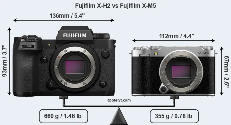 If the front view area (width x height) of the cameras is taken as an aggregate measure of their size, the Fujifilm X-M5 is considerably smaller (41 percent) than the Fujifilm X-H2. Moreover, the X-M5 is substantially lighter (46 percent) than the X-H2. It is worth mentioning in this context that the X-H2 is splash and dust resistant, while the X-M5 does not feature any corresponding weather-sealing.