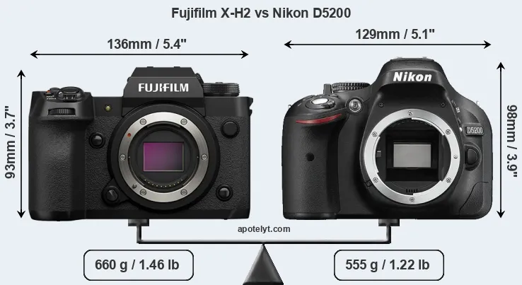 An illustration of the physical size and weight of the Fujifilm X-H2 and the Nikon D5200 is provided in the side-by-side display below. The two cameras are presented according to their relative size. Three consecutive views from the front, the top, and the rear side are shown. All width, height and depth dimensions are rounded to the nearest millimeter.