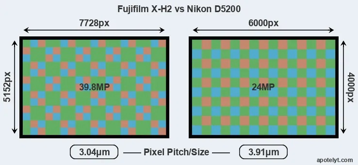 | Sensor Specs | Fujifilm X-H2 | Nikon D5200 |