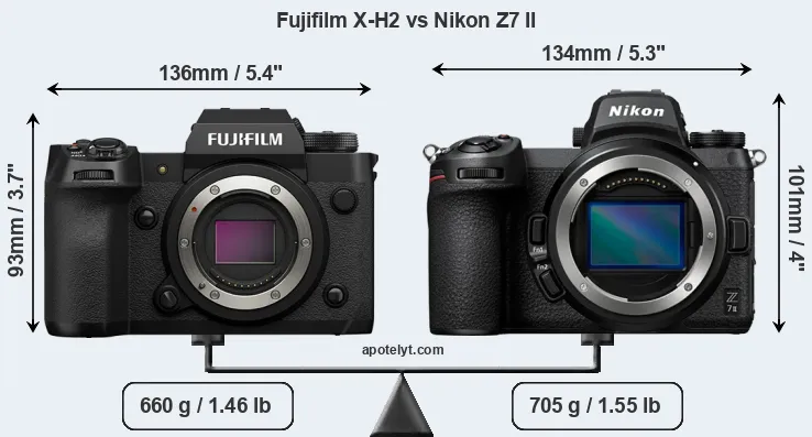 The physical size and weight of the Fujifilm X-H2 and the Nikon Z7 II are illustrated in the side-by-side display below. The two cameras are presented according to their relative size. Three consecutive views from the front, the top, and the rear side are shown. All width, height and depth measures are rounded to the nearest millimeter.