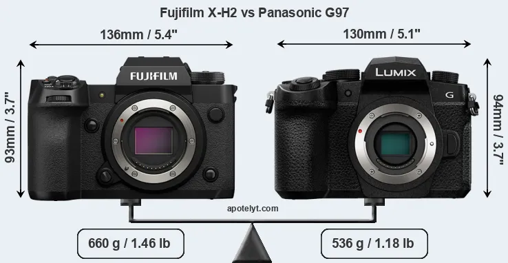 If the front view area (width x height) of the cameras is taken as an aggregate measure of their size, the Panasonic G97 is somewhat smaller (3 percent) than the Fujifilm X-H2. Moreover, the G97 is markedly lighter (19 percent) than the X-H2. In this context, it is worth noting that both cameras are splash and dust-proof and can, hence, be used in inclement weather conditions or harsh environments.