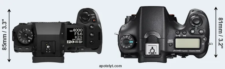 The physical size and weight of the Fujifilm X-H2 and the Sony A77 II are illustrated in the side-by-side display below. The two cameras are presented according to their relative size. Three successive views from the front, the top, and the rear are shown. All width, height and depth measures are rounded to the nearest millimeter.