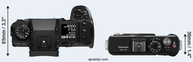If the front view area (width x height) of the cameras is taken as an aggregate measure of their size, the Panasonic GF1 is considerably smaller (33 percent) than the Fujifilm X-H2S. Moreover, the GF1 is substantially lighter (42 percent) than the X-H2S. It is worth mentioning in this context that the X-H2S is splash and dust resistant, while the GF1 does not feature any corresponding weather-sealing.