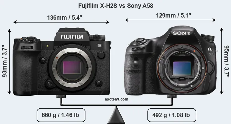 If the front view area (width x height) of the cameras is taken as an aggregate measure of their size, the Sony A58 is somewhat smaller (3 percent) than the Fujifilm X-H2S. Moreover, the A58 is markedly lighter (25 percent) than the X-H2S. It is worth mentioning in this context that the X-H2S is splash and dust resistant, while the A58 does not feature any corresponding weather-sealing.