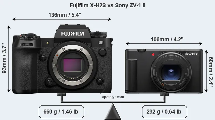 If the front view area (width x height) of the cameras is taken as an aggregate measure of their size, the Sony ZV-1 II is considerably smaller (50 percent) than the Fujifilm X-H2S. It is worth mentioning in this context that the X-H2S is splash and dust resistant, while the ZV-1 II does not feature any corresponding weather-sealing.
