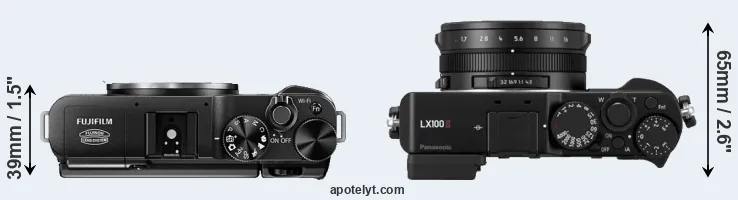 The side-by-side display below illustrates the physical size and weight of the Fujifilm X-M1 and the Panasonic LX100 II. The two cameras are presented according to their relative size. Three successive views from the front, the top, and the rear are shown. All size dimensions are rounded to the nearest millimeter.