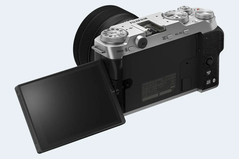 The LCD screen on the Fujifilm X-M5 is flexibly attached to the body. In particular, the LCD is hinged on the side and can be flipped out for odd-angle shots in both portrait and landscape orientation. Also, this fully articulated, swivel type of LCD attachment is often appreciated by videographers for its flexibility. Moreover, v-loggers like the design because the screen can be turned to be front-facing.