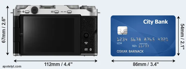The physical dimensions of the Fujifilm X-M5 relative to a credit card are illustrated in the side-by-side display below. Three consecutive perspectives from the front, the top, and the back are presented. All size dimensions are rounded to the nearest millimeter.
