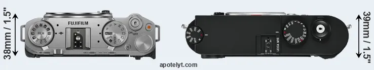 The side-by-side display below illustrates the physical size and weight of the Fujifilm X-M5 and the Leica M10. The two cameras are presented according to their relative size. Three consecutive perspectives from the front, the top, and the back are available. All width, height and depth measures are rounded to the nearest millimeter.
