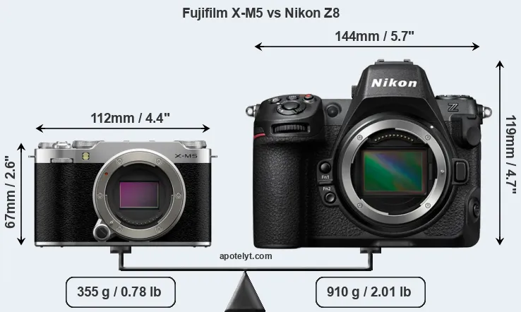 If the front view area (width x height) of the cameras is taken as an aggregate measure of their size, the Nikon Z8 is considerably larger (128 percent) than the Fujifilm X-M5. Moreover, the Z8 is substantially heavier (156 percent) than the X-M5. It is noteworthy in this context that the Z8 is splash and dust-proof, while the X-M5 does not feature any corresponding weather-sealing.