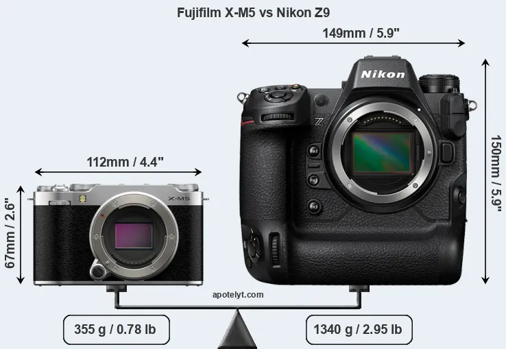 If the front view area (width x height) of the cameras is taken as an aggregate measure of their size, the Nikon Z9 is considerably larger (198 percent) than the Fujifilm X-M5. Moreover, the Z9 is substantially heavier (277 percent) than the X-M5. It is noteworthy in this context that the Z9 is splash and dust-proof, while the X-M5 does not feature any corresponding weather-sealing.