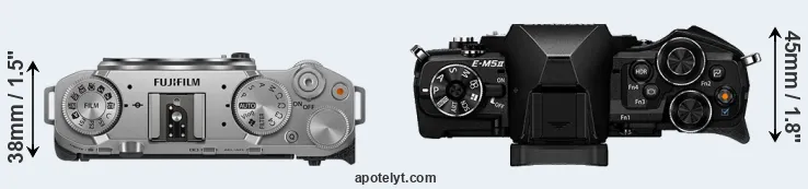 If the front view area (width x height) of the cameras is taken as an aggregate measure of their size, the Olympus E-M5 II is notably larger (40 percent) than the Fujifilm X-M5. Moreover, the E-M5 II is markedly heavier (32 percent) than the X-M5. It is noteworthy in this context that the E-M5 II is splash and dust-proof, while the X-M5 does not feature any corresponding weather-sealing.
