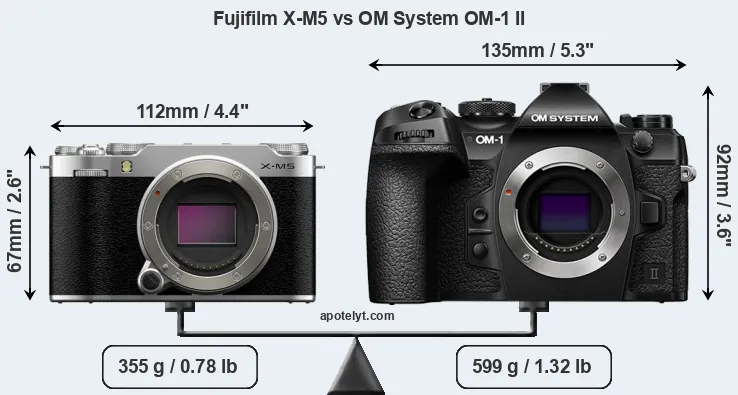 An illustration of the physical size and weight of the Fujifilm X-M5 and the OM System OM-1 II is provided in the side-by-side display below. The two cameras are presented according to their relative size. Three consecutive perspectives from the front, the top, and the back are available. All width, height and depth dimensions are rounded to the nearest millimeter.