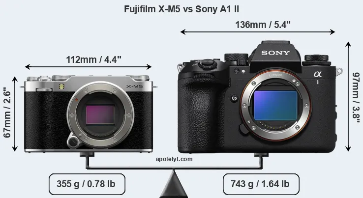 If the front view area (width x height) of the cameras is taken as an aggregate measure of their size, the Sony A1 II is considerably larger (76 percent) than the Fujifilm X-M5. Moreover, the A1 II is substantially heavier (109 percent) than the X-M5. It is noteworthy in this context that the A1 II is splash and dust-proof, while the X-M5 does not feature any corresponding weather-sealing.