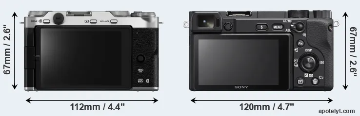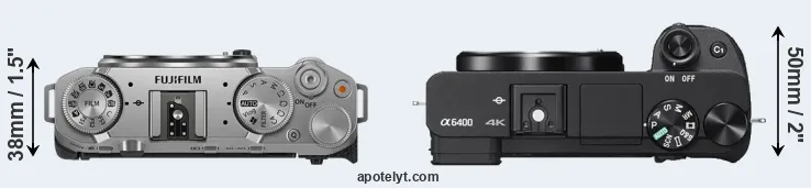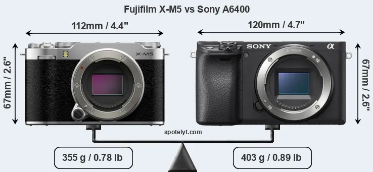 The side-by-side display below illustrates the physical size and weight of the Fujifilm X-M5 and the Sony A6400. The two cameras are presented according to their relative size. Three consecutive perspectives from the front, the top, and the back are available. All width, height and depth measures are rounded to the nearest millimeter.