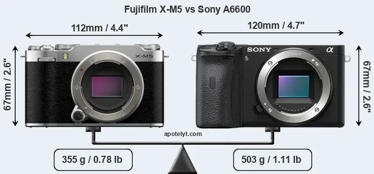 If the front view area (width x height) of the cameras is taken as an aggregate measure of their size, the Sony A6600 is notably larger (7 percent) than the Fujifilm X-M5. Moreover, the A6600 is substantially heavier (42 percent) than the X-M5. It is noteworthy in this context that the A6600 is splash and dust-proof, while the X-M5 does not feature any corresponding weather-sealing.