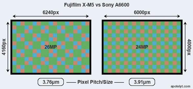 While the two cameras under review share the same sensor size, the X-M5 offers a slightly higher resolution of 26 megapixels, compared with 24 MP of the A6600. This megapixels advantage translates into a 4 percent gain in linear resolution. On the other hand, these sensor specs imply that the X-M5 has a higher pixel density and a smaller size of the individual pixel (with a pixel pitch of 3.76μm versus 3.91μm for the A6600). In this context, it should be noted, however, that the X-M5 is much more recent (by 6 years and 1 month) than the A6600, and its sensor will have benefitted from technological advances during this time that compensate for the smaller pixel size. Coming back to sensor resolution, it should be mentioned that the X-M5 has no anti-alias filter installed, so that it can capture all the detail its sensor resolves.