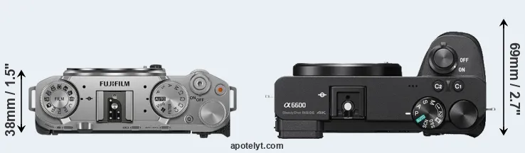 The side-by-side display below illustrates the physical size and weight of the Fujifilm X-M5 and the Sony A6600. The two cameras are presented according to their relative size. Three consecutive perspectives from the front, the top, and the back are available. All width, height and depth measures are rounded to the nearest millimeter.