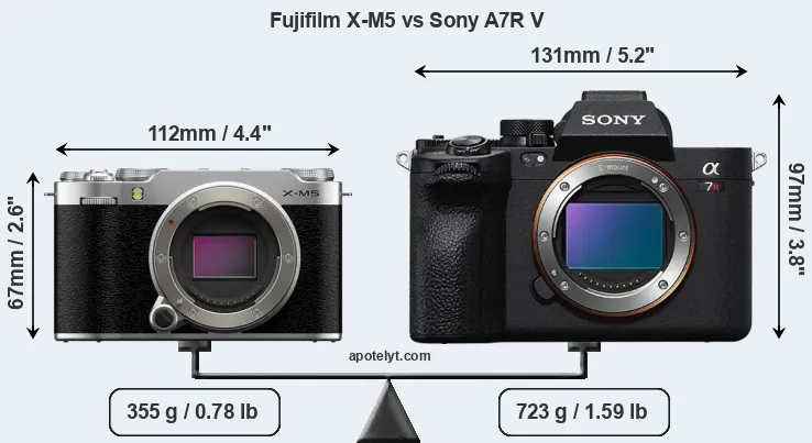 If the front view area (width x height) of the cameras is taken as an aggregate measure of their size, the Sony A7R V is considerably larger (69 percent) than the Fujifilm X-M5. Moreover, the A7R V is substantially heavier (104 percent) than the X-M5. It is noteworthy in this context that the A7R V is splash and dust-proof, while the X-M5 does not feature any corresponding weather-sealing.