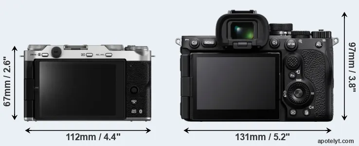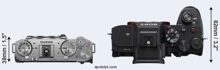 The side-by-side display below illustrates the physical size and weight of the Fujifilm X-M5 and the Sony A7R V. The two cameras are presented according to their relative size. Three successive views from the front, the top, and the rear are shown. All width, height and depth dimensions are rounded to the nearest millimeter.