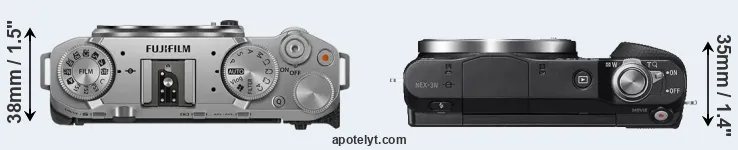 If the front view area (width x height) of the cameras is taken as an aggregate measure of their size, the Sony NEX-3N is notably smaller (9 percent) than the Fujifilm X-M5. Moreover, the NEX-3N is markedly lighter (24 percent) than the X-M5. In this context, it is worth noting that neither the X-M5 nor the NEX-3N are weather-sealed.