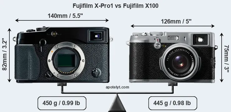 The physical size and weight of the Fujifilm X-Pro1 and the Fujifilm X100 are illustrated in the side-by-side display below. The two cameras are presented according to their relative size. Three consecutive perspectives from the front, the top, and the back are available. All size dimensions are rounded to the nearest millimeter.