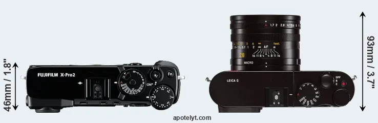 If the front view area (width x height) of the cameras is taken as an aggregate measure of their size, the Leica Q Typ 116 is notably smaller (11 percent) than the Fujifilm X-Pro2. It is worth mentioning in this context that the X-Pro2 is splash and dust resistant, while the Q Typ 116 does not feature any corresponding weather-sealing.